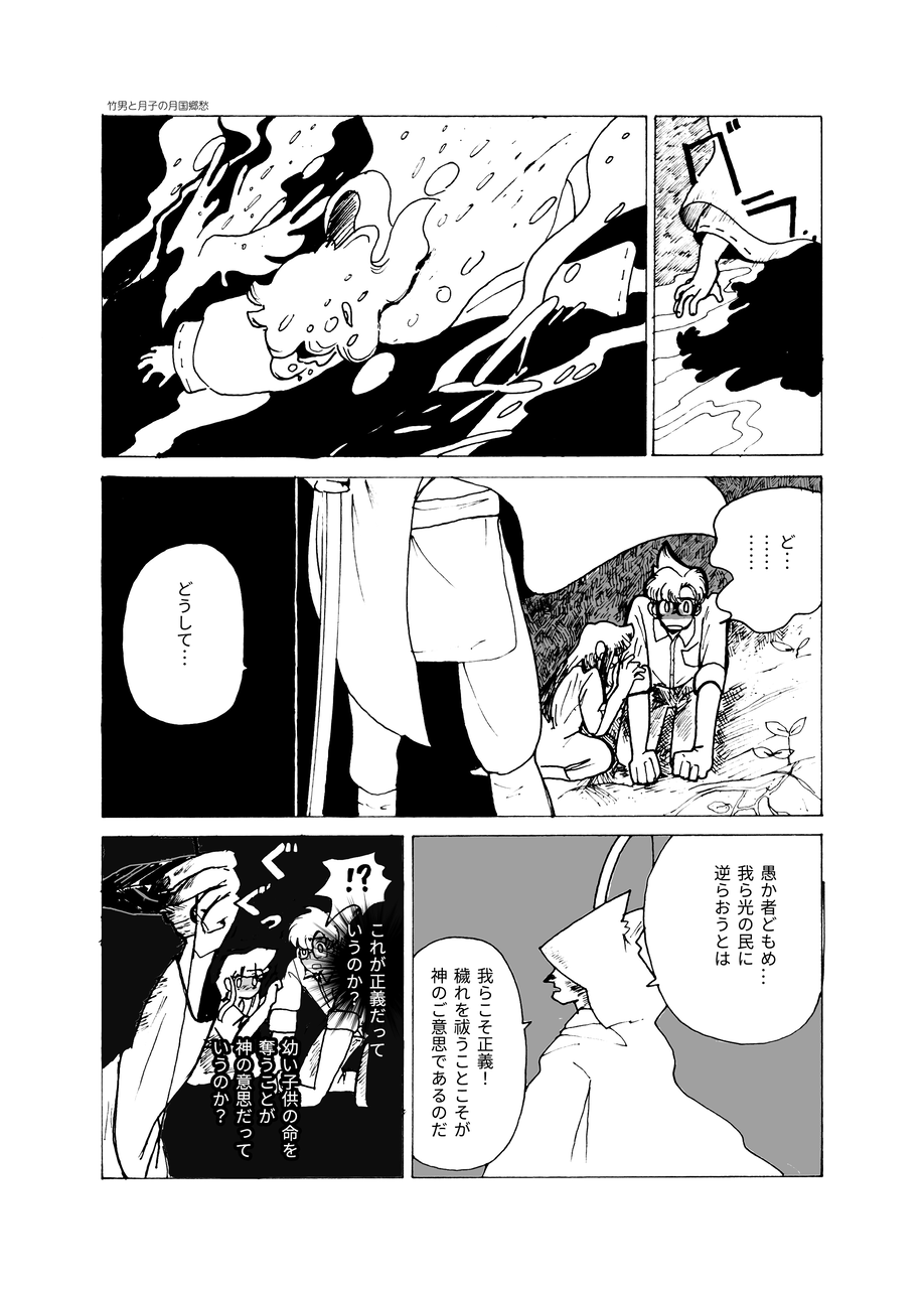 2019年12月20日 12月18日第6章「心」その18 漫画 竹男と月子の月国郷愁プロローグへ第一章「蚕の衣を纏った白うさぎ」へ第二章「書物に宿るモノ」へ第三章「待ち人」へ第四章「消えない痛み」へ第五章「ひとりじゃない」へ第六章「心」その1 その2 その3 その4 その5 その6 その7 その8 その9 その10その11 その12 その13 その14 その15 その16 その17 その18 <149ページ目>水の中へと倒れる少女とヤト。彼らを見下ろす狼男のマントが風に吹かれてなびく。「我らこそ正義。穢れを祓うことこそ、神のご意志であるのだ」それを聞いた竹男は・・・。次回に続く!